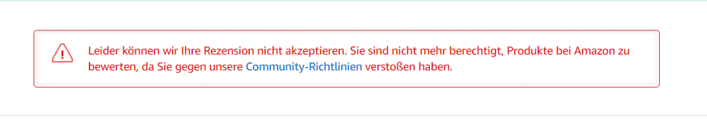 Genau diese Meldung erscheint, wenn Amazon der Meinung ist, man hätte z.b Gefälligkeitsrezis geschrieben – ein Produkt absichtlich positiv bewertet, oder sich hat bestechen lassen …..